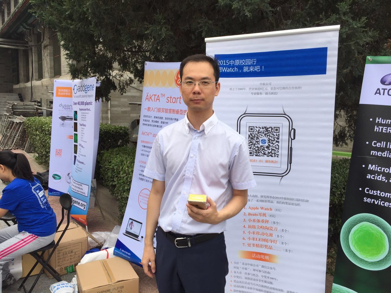 2015年9月22日,“中原校园行”系列活动,在中国医学科学院基础所举办。活动当天,虽然天公不作美,随时都有可能下雨。但仍然阻挡不了老师和同学参加的热情。活动展台前人头攒动,大家都纷纷拿出手机参与活动,领取属于自己的幸运大奖。