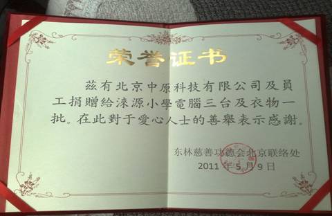为此功德会办事处负责人对中原公司提出特别感谢,感谢中原公司对贫困地区人民的关爱以及对孩子们未来教育的无私奉献,并特向中原公司颁发了荣誉证书。