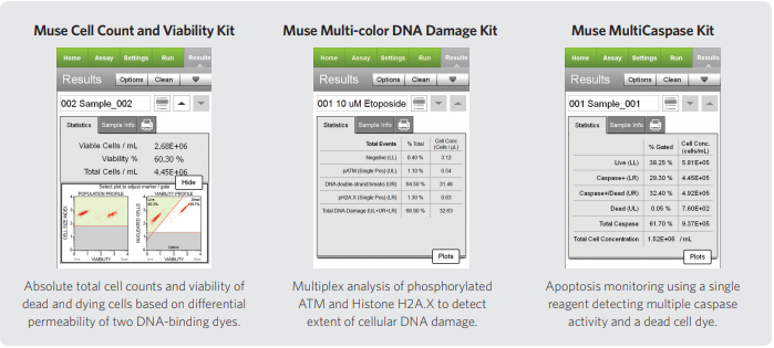 Muse®配套高品质预包装试剂盒,样本制备简单快速。预置实验检测方案,对应检测模块软件参数已优化。获取图形及统计数据结果,分析更加清晰。节省实验操作时间,避免试剂浪费,节省经费。