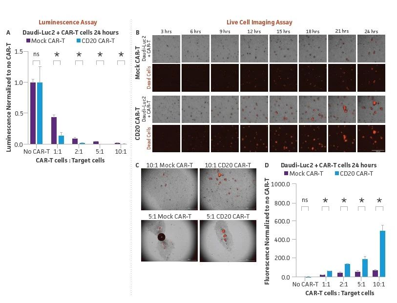 图4:使用发光和活细胞成像技术对Daudi-Luc2进行CD20 CAR-T体外杀伤试验。(A) 将CD20阳性的Daudi-Luc2细胞(5 x 103)接种到96孔板中,并用来自同一供体的CD20 CAR-T或Mock CAR-T(对照)的靶细胞,CAR-T细胞与靶Daudi-Luc2细胞分别以不同比例(1:1,2:1,5:1,10:1)接种。在共培养24小时后,在指定的孔中加入Bright-Glo。用发光板阅读器在10分钟内读取板的发光,确定与CD20 CAR-T细胞有剂量依赖性的特异性杀伤,这比用模拟CAR-T细胞观察到的非特异性杀伤要大(*=差异明显,ns=不明显,使用非配对t检验,有一个集合的方差)。(B) 在培养基中存在Incucyte Cytotox红色染料的情况下,将Daudi-Luc2细胞(5 x 103)与CD20 CAR-T细胞或Mock CAR-T细胞共同培养,并在24小时内每小时测量一次实时荧光成像,结果与CD20 CAR-T共同培养时,荧光强度比与Mock-CAR-T细胞共同培养时增加。(C)与CD20 CAR-T细胞共培养24小时后,与Mock CAR-T细胞共培养相比,Daudi-Luc2显示死亡(红色)荧光细胞数量增加。(D) 对聚集的红色荧光进行了量化和比较(*=差异明显,ns=差异不明显,使用非配对t检验,具有单一合并方差)。