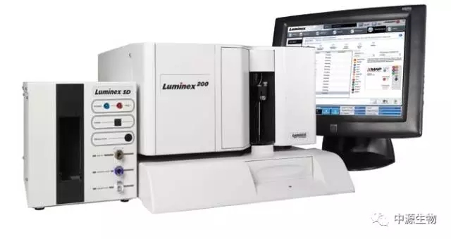 Luminex 技术应用微球和流式细胞仪的原理。微球内部含有两种不同颜色的免疫荧光,通过荧光不同的比例可以区分多达100种不同的微球。每种微球可以用来检测一种不同的蛋白或基因。因此,利用微球技术可以同时检测高达100个蛋白。该技术利用荧光编码的微球共价交联单克隆抗体,与被测定的目标分子结合后,加入荧光素标记的检测抗体,再通过激光扫描荧光编码来识别单个微球和测量“检测荧光”强度来确定被测分子的浓度。