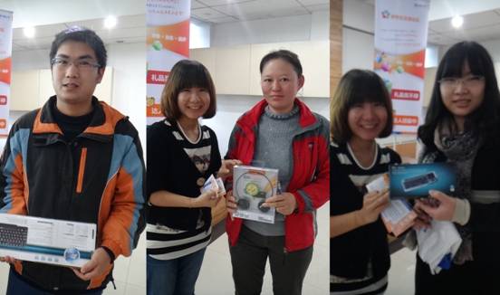 中原公司研究生交流论坛的一个重要环节,就是最激动人心的抽奖环节,除了每一位到场的老师和同学都能获得疯狂的小鸟一只外,我们还现场抽取了三套愤怒小鸟公仔,迷你键鼠,无线音乐耳机和无线键鼠套装三个大奖,恭喜如下获得大奖的六位幸运儿
