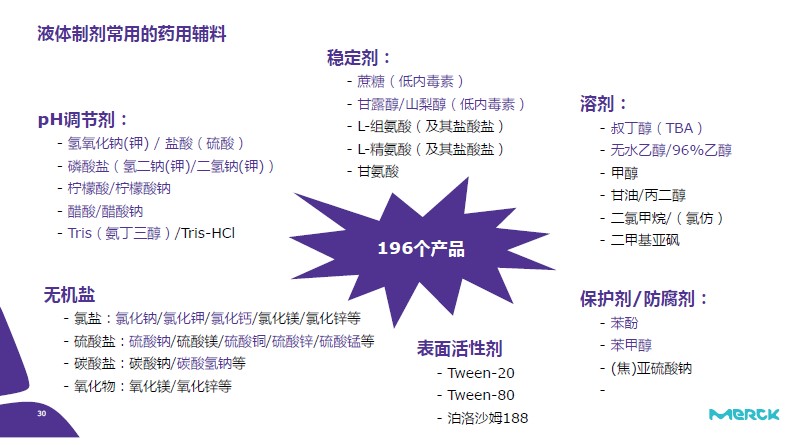 默克的药用辅料按照应用方向可以分为以下几类:固体制剂、液体&半固体制剂、生物医药用制剂及一些常用的原料药产品。下图列举了液体制剂中常用药物辅料产品。