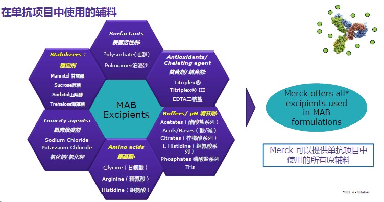 下图中列举了在单抗药物生产中会用到的各种辅料产品,如:稳定剂、表面活性剂、螯合剂/络合剂、PH调节剂、氨基酸和肌肉张度剂等。默克可以提供以上全部过程中的原辅料产品,为您的单抗药物开发保驾护航!