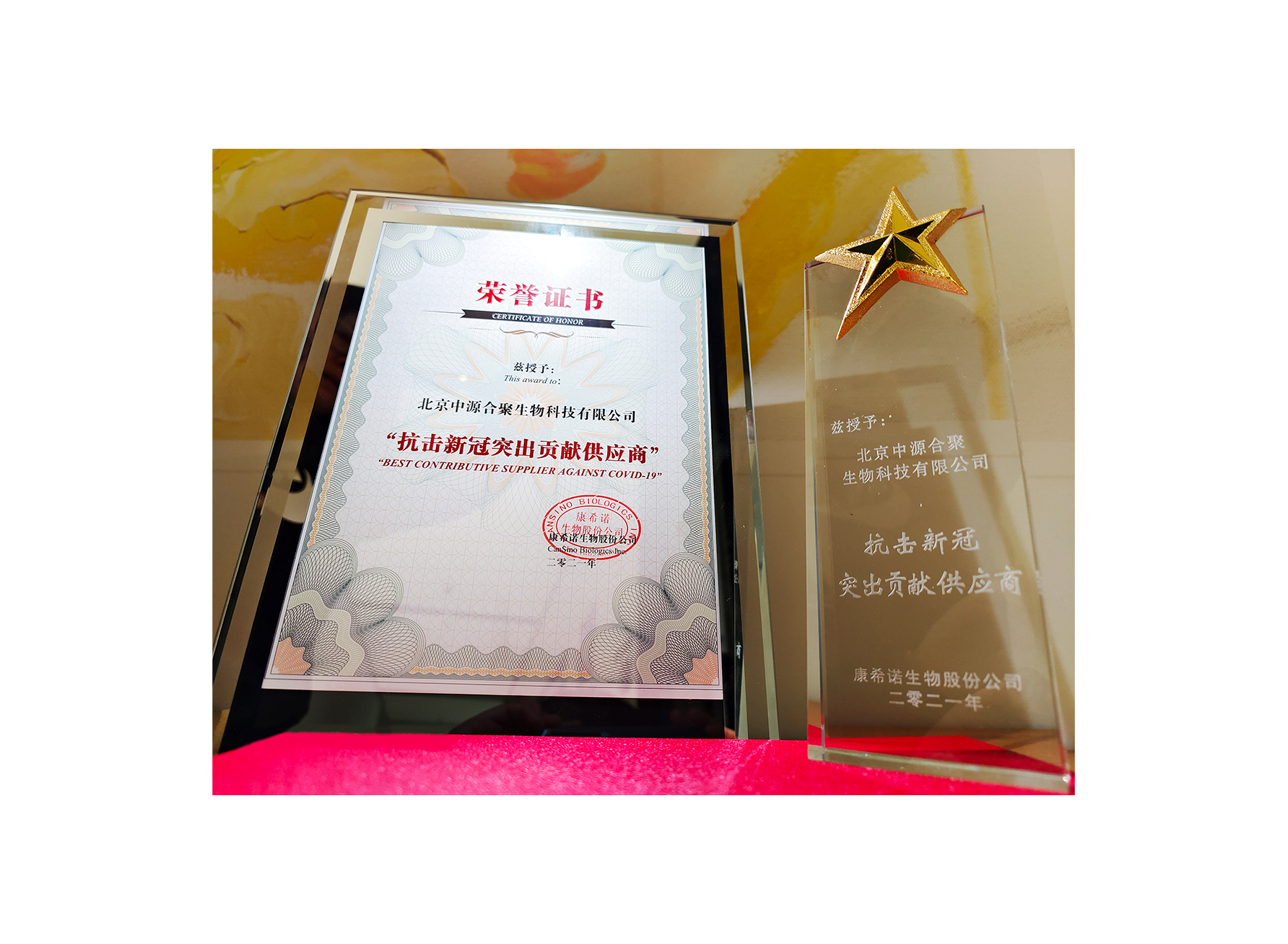 荣获康希诺生物“抗击新冠突出贡献供应商奖”